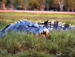 Das ließ ich mir nicht zwei Mal sagen. Ab nach Adelaide River, wo sich eine große Station für große Jungs aufgebaut hat. Man kann sich auf einem Schiff einen Platz mieten, was einen sehr nahe an die Krokodile bringt, oder was Nettes ausdenken: Hubschrauber, wo die crocs bis an die Kufe hüpfen. Wir hatten keine Wahl, denn als wir ankamen, war der letzte Dampfer schon abgefahren. So kamen wir in den Genuss eines wahrlich nach Abenteuer riechenden Flugs. Die Aussies, keine Amerikaner, lassen die Gäste sogar im Flug auf die Kufe des Hubschraubers steigen, und die Echsen hüpfen gerade so hoch, dass man … Uff!
