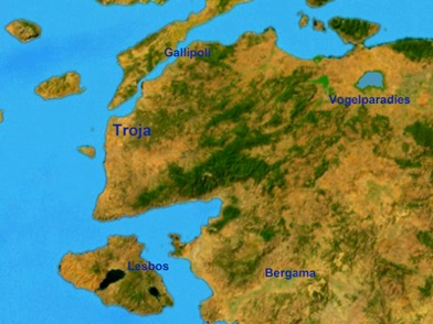 Es lohnt sich, eine Reise nur nach dem Berg Ida und seine Umgebung vorzunehmen. Er endet an zwei Meeren, deren Küsten mit vielen Olivenhainen umsäumt sind. Mindestens drei Orte von Weltbedeutung befinden sich in seinem Umkreis: Das Troja von Schliemann, die Dardanellen mit Gallipoli, das man als Geburtsstätte der neuen Türkei annehmen darf, und Pergamon, über dessen Bedeutung man nicht viele Worte machen muss.