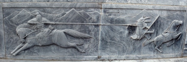 Deren Kriegskunst sahen die Chinesen auch so und besänftigten lieber deren Oberhäupter, Han oder Khan tituliert, mit milden Geschenken in Form von Prinzessinnen. Die sind aber weder in Peking noch an der Großen Mauer so abgebildet, weil nicht jugendfrei. Man solle nur den wilden Reiter im unteren Bild mit dem da oben vergleichen, der am Ende der Schlinge hängt. Der Chinese holt ihn vom Sattel. So war es denn auch. Nur wenige Kilometer nördlich von Peking kommt man an die Große Mauer, die die wilden Horden zurück halten sollte. Die Fremden schon aber in Peking eingefallen, aber aus welchen Gründen immer wieder an die heimische Jurte (heißt Heimat, Heim) zurück gekehrt.