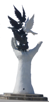 Beladen mit zwei Pizzabäckern und einem Rucksack torkelte ich in den Bomber und legte mich schlafen. Jeder hatte so drei bis vier Sitze für sich und reichlich Decken und Kopfkissen. Als der Flieger abhob, muss die Maschine eher wie ein Schlafsaal ausgesehen haben. Ich habe aber nichts mehr gesehen und schlummerte bis zum Aufsetzer in der Türkei. Die Nacht packte gerade ihre Sachen und wollte sich verabschieden. Die Schlafbrigade kam langsam in Schwung. Nur noch zwei Busfahrten, eine in die Stadt zum Busbahnhof, die nächste nach Kuşadası - und schon stand ich an einem Strandcafe, fast exakt im Osten von Athen. Vor mir eine Statue mit seltsamen Vögeln. Die Hand zeigte Richtung Westen und ließ Tauben frei, Friedenstauben als Nachricht für die Griechen. Davor ein uralter Olivenbaum. Ein türkischer Außenminister und der griechische Premier haben das Denkmal eingeweiht. Tauben und Olivenzweig - Türken und Griechen müssen sich verstehen.Und wie soll ich das verstehen? Erklärung auf der nächsten Seite …