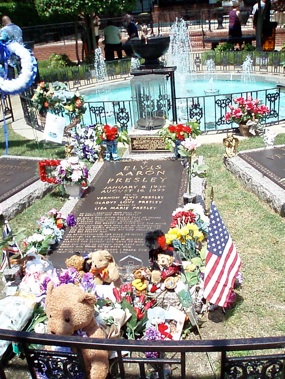 Es sollte aber noch schlimmer kommen. Nachdem man in einer Stunde durch Wohnzimmer, Elternschlafzimmer, Esszimmer, Küche, Fernsehzimmer, Pool-Zimmer, das Familienzimmer, den "Dschungel", sowie den Anbau im Haupthaus getourt ist und hinter dem Haus sein "racquetball" Gebäude und sein original Büro besichtigt hat, gelangt man in den "Meditation Garden" in dem Elvis und Mitglieder seiner Familie zur letzten Ruhe gebettet sind. Dort fand ich aber nichts, was an Meditation erinnert. Eine Menge Plastikblumen sah ich um sein Grab herum aufgestellt. Bunt und schrill. Passt gar nicht zu seiner Stimme, so etwa beim Singen von „As the snow flies/On a cold and gray Chicago mornin'/A poor little baby child is born/In the ghetto (In the ghetto)/And his mama cries …