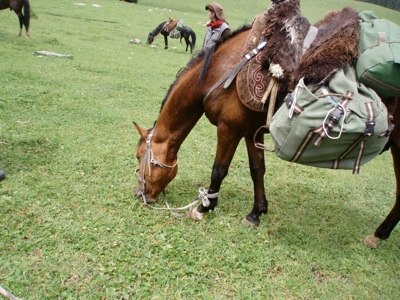 Die Pferde blieben, wie immer, draußen. Bei kurzer Rast bindet man die Zügel am Vorderlauf fest, mit einem Webeleinstek, auf Slip gelegt, so dass sich die Tiere ganz langsam von der Meute weg bewegen können, aber nicht ganz und gar. Für die große Pause am Abend trägt jedes Pferd eine lange Leine plus Pflock am Sattelhorn. Manche Tiere hatten wohl gelernt, wie man dieses Ding aus der Erde zieht, und waren morgens etwas weiter weg als geplant. Einmal musste sogar der Hengst des Chefs zur Rückkehr an seinen Arbeitsplatz überredet werden.