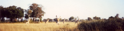 An einem schönen Tag war uns das Glück endlich hold: Eine große Herde Giraffen trabte rechts neben uns her und fing an zu galoppieren, als wir uns ihr näherten. Da sie keine Angst hatten, hielten sie einen geringen Abstand. Es wurde ein Ritt, wie er berauschender hätte nie sein können. Zum Glück war die Sonne hinter uns, so dass jeder Reiter einen eigenen Regenbogen entwickelte. Acht Reiter im gestreckten Galopp, dazu zwei Dutzend Giraffen im gemächlichen. Die Pferde schoben eine richtige Bugwelle vor sich her, in der das Licht der Sonne eben den besagten Regenbogen zauberte. Ein Regenbogen da, wo es alle sieben Jahre regnet!