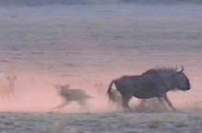 Gnus pflegen in der Natur sogar Löwenfamilien anzugreifen, in Tateinheit mit Büffeln, um die Babies zu töten, ehe sie sich zu wilden Jägern mausern. Zuweilen kann nicht einmal die mächtige Löwenmama verhindern, dass ihre kleinen Kinder unter die Hufe des künftigen Bratens geraten. Richtig in Laune kommen die Gnus, wenn sie von Wildhunden angegriffen werden. Diese sind zwar wesentlich kleiner als die großen Jäger, dafür treten sie in Kompaniestärke an und dazu ganz schön frech. Der ungleiche Kampf geht häufig zugunsten der größeren Gnus aus, aber nicht immer. Das wissen die Wildhunde und versuchen es, sooft es geht.