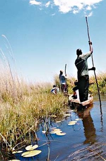 Vor dem Lagerfeuer am Wasser schaukelten sanft die Mokoros, die Einbäume zum Staken. Sie tragen bis zu vier fünf Personen oder entsprechend viel Gepäck. Wenn das Wasser zu heftig kommt und das Land zum größten Teil tief begräbt, versorgen die Boote die Außencamps. Auch ein Schnorchel hilft dem Truck nicht mehr weiter, der aber immerhin in so tiefem Wasser fährt, dass die Insassen bis zum Bauch nass sind.