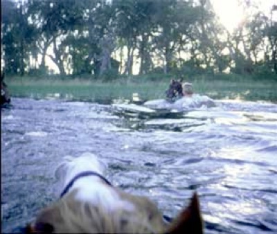So lief mir ein Schauer über den Rücken, als wir das erste Mal eine tiefe Stelle schwimmend überqueren mussten. Dazu wurden die Pferde nackich ausgezogen, während die Reiter nur die Stiefel abgaben, die nicht voll nass werden sollten. Man liegt dann halb auf dem Pferderücken mit der Mähne in der Hand, bis der bestimmte Moment kommt. Das ist, wenn das Pferd den Boden unter den Füßen verliert. Dann fängt es an, zu galoppieren, d.h. es versucht den gestreckten Galopp. Ich wollte just diesen Augenblick fotografieren und hielt meine Taucherkamera in der rechten Hand, als mein Pferd genau das tat. Ich rollte rückwärts über seinen Rücken, während mein Zeigefinger den Auslöser festhielt. So entstand eine Fotoreihe mit einer ungewöhnlichen Perspektive am Anfang und mit einer trüben Sicht am Ende. Zum Glück war ich nicht genau nach hinten gerollt. Sonst hätte ich wohl ein paar Huftritte in die Magengegend gekriegt. Ob das Trampeln des Pferds die Krokodile abgehalten hat?