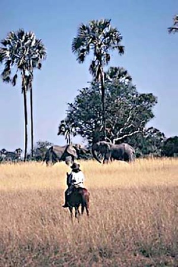 Das Gefühl, etwa 30 Meter neben einem Elefanten in der freien Wildbahn zu reiten, kommt mir heute noch unbezahlbar vor. Es wurde noch getoppt durch die Angst, als wir etwa 20 Meter vor zwei grasenden Bullen standen. P.J. hatte uns eingeschärft, kein einziges Wort zu wechseln und den Pferden etwas zu erlauben, was Reitpferde nur nach Feierabend dürfen, grasen. Da Elefanten schlecht sehen aber umso besser hören, denken die dicken Jungs an Zebras. Wir mussten uns wie ein Fächer vor den Elefanten aufstellen, damit jeder bei einem Angriff in eine andere Richtung abdüst. Ganz sachte schlichen wir uns vor, bis wir wohl die Intimgrenze überschritten haben. Der größere Bulle ließ seinen Partner weiter grasen und kam mit erhobenem Rüssel auf uns zu.