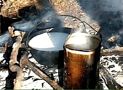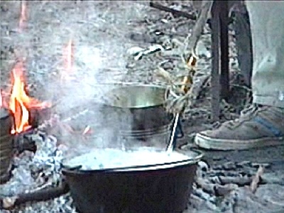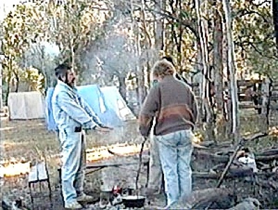 Sobald ich meine klamme Bettstelle verlassen hatte, schmiss ich das Feuer wieder an. Die Asche war noch warm, etwas Glut guckte unter der Asche hervor, so dass es nicht lange dauerte, bis die Flammen ihr wärmendes Tagwerk begannen. Dann kam die wahre Kunst des Outback-Menschen - Englisches Frühstück ohne englische Küche. Porridge z.B. wird in einem Kessel gerührt. Da die Kochstelle keine optimale Höhe aufweist, muss die Kelle künstlich verlängert werden. Während frau die Kelle schwingt, wärmt man sich auf.