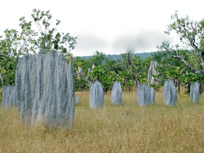 Die Bauten der magnetic ants ragen zwar ohne erkennbares Muster aus der Erde, sie sind aber erstens nicht rund und zweitens parallel ausgerichtet. Sie verlaufen alle in Nord-Süd-Richtung und sehen sehr grau aus. Die anderen Termitenhügel weisen Farben von beige bis rötlich auf, was auf eine besondere Lebensweise der magnetischen Verwandtschaft schließen lässt.