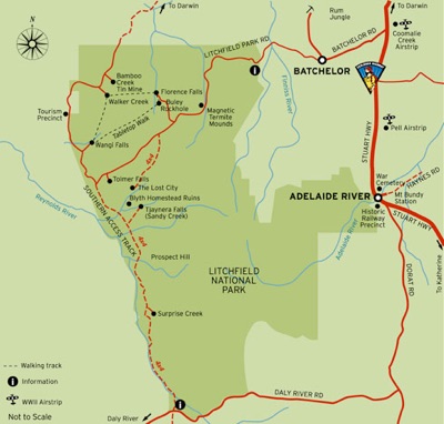 Dabei befindet sich Lost City ganz in der Nähe von Darwin im Litchfield National Park. Durch die Nähe zu Darwin ist der Litchfield National Park ein ideales Tagesausflugsziel. Wenn man den Park genauer erkunden möchte, sollte man sich zwei bis drei Tage Zeit nehmen. Landschaftlich zeichnet sich der National Park durch eine üppige, tropische Vegetation, Steilwände aus Sandstein, Termitenhügel, ungewöhnliche Felsformationen sowie seine pittoresken Wasserfälle aus.