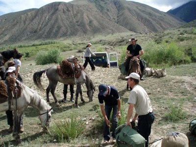 Die Pferde wurden beladen mit allem, was wir für die ersten Nächte benötigten. Später sollte ein Auto weitere Utensilien an einen Treffpunkt bringen. Bereits das erste Stückchen Ritt roch nach Abenteuer, den Hang in den Fluss reiten und heil auf die andere Seite kommen. Unsere drei Guides schienen Profis zu sein. Einer, der Chef, ritt voran, einer, der Dolmetsch, stand am Fluss, während der dritte im Bunde hinter uns stand. Da die Tiere ebenso Profis zu sein schienen, hielt sich die Aufregung in engen Grenzen. Das einzige Problem bildete die Fotografiererei. Dazu musste man stehen bleiben, am besten dort, wo es am gefährlichsten ausschaut. Auch das schien den Pferden kaum Sorge zu bereiten. Leider haben sie bei jedem Halt, der unserer Begeisterung für die Natur entsprang, ihrer Begeisterung für dieselbe freien Lauf gelassen - schnell ein Büschel Gras ins Maul. Deswegen sind nicht wenige Bilder verwackelt, Videos ohnehin.