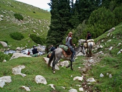 Die Truppe wurde von einem Kleinbus zum Barskoon Canyon zu den Pferden gebracht, die uns außer sich vor Freude begrüßten. Wenn man ehrlich ist, müsste man gestehen, dass die Pferde von uns eher keine Notiz genommen haben. Das sollte die ganze Reise so bleiben, keine Liebeserklärung, keine Schmuserei, auch nicht Leckerli oder Zuckerli. Eine indifferente Geschäftsbeziehung …