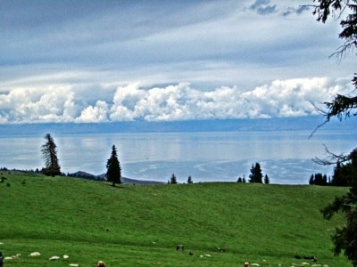 Immer mit dem See im Rücken kletterten wir unablässig höher. Während dieser immer kleiner wurde, erwischten uns seine Produkte dann und wann - die Wolken. Der Wind trieb am Nachmittag die vom See aufsteigende warm-feuchte Luft die Hänge hoch, und diese hatte nichts Besseres zu tun, als abzuregnen. Bereits mittags hatten wir die 2.000 m hinter uns gelassen, wobei die Pferde bereits beim Schritt gehen ordentlich nass geschwitzt waren. Insgesamt sind wir, d.h. die Pferde, etwa 1.300 Höhenmeter geklettert.