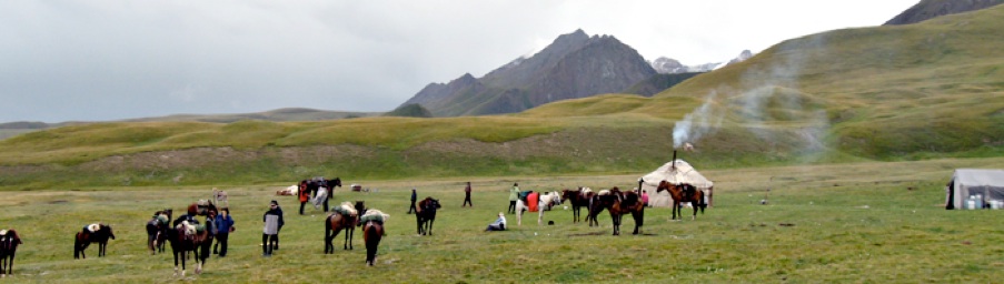 Die Kirgizen sind unwahrscheinlich gastfreundlich. Dennoch muss man als ungebetener Besucher sein Pferd mit kurzer Leine anbinden, auch wenn man zum Essen eingeladen wird. Erst wenn die Pferde mit eingeladen sind, darf die Leine verlängert werden. Hier ist kein wildes Land, sondern Almwirtschaft, freilich weit oberhalb der Baumgrenze.
