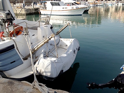 Dass die Griechen heute nicht mehr so kriegerisch sind wie einst, kann man an dem Dingi des Bootes der Küstenwache sehen. Das Boot hatte keine Kanone mehr, und das Dingi keine Luft. Das eine finde ich gut, das andere hingegen schlimm. Denn die Küstenwache soll nicht Krieg führen, sondern die segelnden Touris davon abhalten, sich selbst zu versenken. Wer in Seenot gerät, sendet sein SOS - leider nicht mehr in, man muss heute mayday rufen - und wird flugs von den Helden der sieben Meere aus den Wogen gezogen. Die ganze Zeit, als wir im Hafen lagen, dachte ich an Odysseus, wie der mit diesem Dingi seine Odyssee wohl abfahren würde.