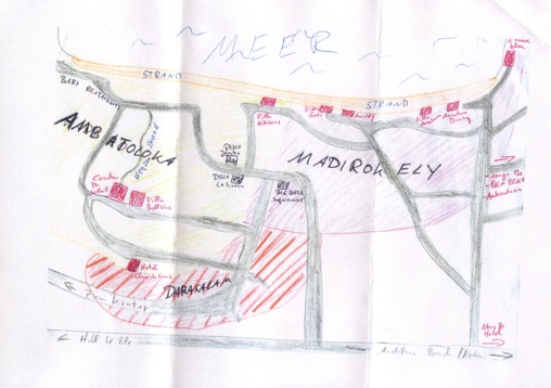 Dann ab zum Strand. Etwa 1,5 km Strand haben sich zwei Orte unter sich aufgeteilt, Madirokely rechts und Ambatoloka links. Dahinter befindet sich das Dorf Darassalam, in dem nicht nur Touris leben, sondern richtige Menschen. Dieser Strand soll Modell für die Tourismusentwicklung von Madagaskar sein. Tatsächlich finden sich hier etliche Hotels, deren Abstand vom Strand sich täglich zwei Mal erheblich ändert. Bei Springflut ist kein Strand mehr übrig, die Wellen schlagen direkt an die Häuser und sammeln allerlei Äste, Blätter und Schilf zusammen. Bei Ebbe wird der Strand so um die 80 m breit. Nix wie hin, Grundstücke verkaufen …