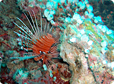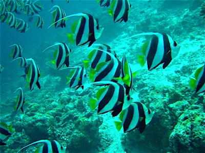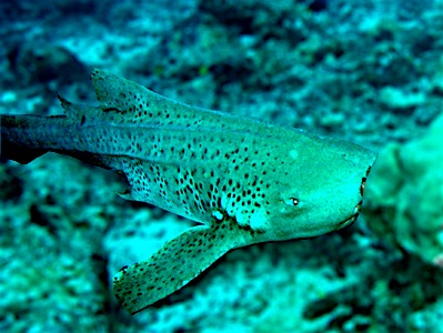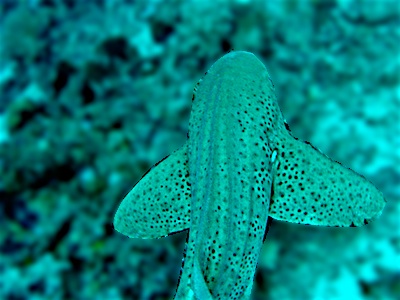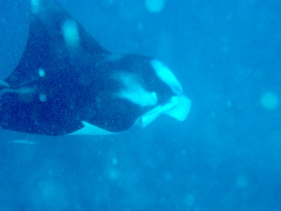 Noch ein paar Figuren, die keinen Bock auf Taucher im Gummimantel haben, hatten wir einige Tage früher gesehen. Das waren zunächst Mantas, die bekanntlich nur Plankton vertilgen und deswegen meist nur im Trüben zu finden sind. Dann macht die Kamera leider nicht so scharfe Bilder, weil das Plankton ihre Aufmerksamkeit auf sich zieht. Gar kein Bild machte meine Kamera aus Mobulas, das sind die Babies der Manta, genau gesagt, kleinere Teufelsrochen. Die ganz großen heißen Riesenmanta und sind, wie mir eine bekannte Online-Quelle verraten hat, ovovivipar. Wem das zu hoch klingt, sollte nach Guppy gucken. Die leben auch im Trüben, oft in Reisfeldern, und schmeißen die Babies lebend aus dem After raus anstelle sie anständig abzulaichen und auszubrüten. Die gut erzogene Verwandtschaft der Mantas, die Haie, machen es mal umgekehrt. Sie kleben die Eier im Riff an passender Stelle, wo man die Entstehung des Nachwuchses sogar mal filmen kann, so man die Stelle passiert.
