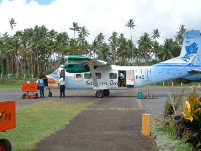 Das Flughafengebäude von Savu Savu wies die Abmessungen einer Bushaltestelle in Berlin auf, allerdings war sie nicht so modern ausgerüstet. Die Sitzbank war noch aus Holz. Drei Menschen verließen den Flieger, vier stiegen ein, bevor der Gärtner die Piste frei machte. Die Heron düste Richtung See, überflog eine Insel, ca. 10x10 m mit einer Palme darauf, und nahm Kurs auf Taveuni. Dort wartete ein Taxifahrer auf mich, schlafend neben der Landebahn.