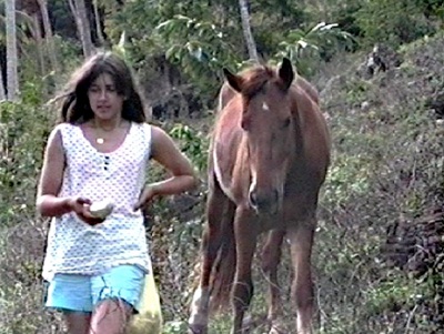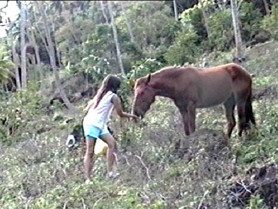 Drei Jahre später kehrte ich mit meinen Kindern zurück, die ein probates Mittel fanden, die Pferde aus dem Urwald zu locken, wo sie sich seit mehreren Jahren gemütlich gemacht hatten. Kokosnuss! Kaum waren die Gören mit einem Beutel Kokosnussfleisch unterwegs, lugten schon zwei Pferdeköpfe aus dem Gebüsch. Die Damen mussten den Pferden die Nüsse wie Sauerbier anbieten, bis der erste Biss gelandet war. Nun gab´s kein Halten. Die Mädels konnten sich vor den Viechern kaum retten. Erst als beide Beutel