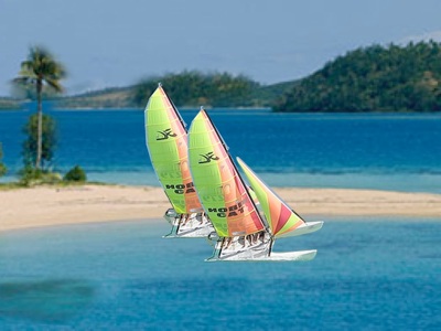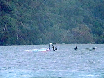 Die dramatische Rettungsaktion im Bild verursachte einer der Nachfahren der Kat-Erfinder. Er wollte mir nicht glauben, dass man bei einem solchen Wetter (etwa 6 - 7 Bft) nicht allein auf See geht. Recht hatte er eigentlich, weil er mich nur eine halbe Stunde davor draußen gesehen hatte. Was er nicht wusste, war die Tiefe, in der mein Herz hing, nachdem ich festgestellt hatte, dass der Wind eben so stark war. Mit Müh und Not nach Matagi zurück gekehrt, sah ich ihn wegrauschen. Als er vor der Nachbarinsel eine Halse versuchte, schaffte er das, was Hobie 14 Fahrer öfters bewerkstelligen. Das Boot versinkt mit dem Bug in der Welle und der Mast schießt einen in hohem Bogen nach vorn, wenn man nicht rechtzeitig den Trapezgurt geöffnet hat. Ganz so tot wie der Fliegende Holländer ist man zwar nicht, aber sich ein paar Gräten brechen kann man schon.