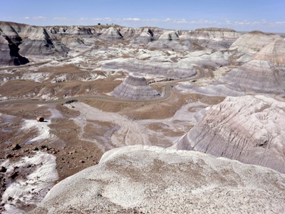 In amerikanischen Verhältnissen gesehen unweit des Monument Valley befindet sich eine besondere Wüste, Painted Desert. Sie war den spanischen Eroberern schon aufgefallen, die sie El Desierto Pintado nannten. Später wurde der Name von den Amerikanern einfach übernommen. Der Nationalpark, der diese Wüste einschließt, endet in einem bizarren Land, nachdem man durch ein noch bizarreres gefahren ist - Badlands. Ganz am Ende findet man eine versteinerte Landschaft, allerdings nicht aus Felsen, sondern aus Bäumen. Manche von denen sehen aus, als wären sie vor ein paar Jahren hingefallen und keine Zeit gefunden, zu verrotten. Die Gegend wird Petrified Forest genannt- ein versteinerter Wald. Übrigens, in dieser Landschaft, die Wüste heißt, leben viele Pflanzen, nur nicht überall und auch nicht üppig. Unsere Vorstellung von Wüste ist eher durch die Bilder der Sahara geprägt.