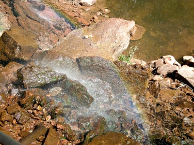 Die prächtig aussehenden Felsen sind so fest wiederum nicht, dass sie sich vom Wasser nur äußerlich abschaben lassen. Das Wasser kann so gemein sein, dass es durch den Felsen durch geht. So einen weinenden Felsen konnte ich sogar filmen. Was wie ein Wasserfall aussieht, ist Gestein, aus dem Wasser gepresst wird. Es füllt eines der drei „Emerald Pools“ auf, drei Becken, die wegen ihrer Farbe so genannt werden (Smaragd“). Mich hat eher der ständig anwesende Regenbogen interessiert, der die Leute so fasziniert, dass sie nicht merken, dass sie nass werden.