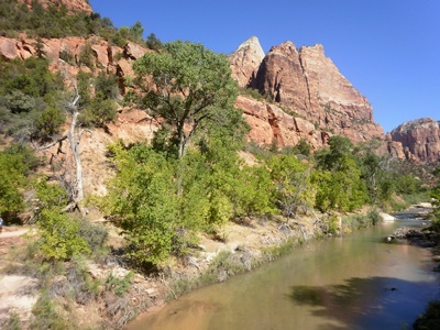 Ob die immer wiederkehrenden Probleme des Tals mit dem Zorn des Manitu zusammenhängen, der sein Reich gern für sich behalten hätte, weiß ich nicht. Das Problem heißt „Flash Flood“ wie häufig in der Wüste. Man stelle sich vor, dass ein kaum fünf Meter breiter Bach sich plötzlich dazu ermächtigt fühlt, ein Tal von mehreren Hundert Metern Breite, bereichsweise über ein Kilometer, nicht nur aufzufüllen, sondern auch an den Kanten hochzukrabbeln. Schwer vorzustellen, wenn man in Nordeuropa wohnt. Bei dem Bach, der eigentlich Virgin River heißt, ist es leicht zu glauben, letztlich hat er das ganze Tal ausgegraben. Er ist nicht überall so klein und fein wie in Zion. Ist über 250 km lang und geht im Colorado auf. Aber vorher mischt er das Tal Zion mächtig auf, wenn Wind und Wetter gut zusammen passen. Der übliche Tourist, der die breiteren Teile des Tals, eigentlich Virgin River Gorge, bevölkert, ist der Gefährdung nicht so sehr ausgesetzt wie der Wanderer, der mit dem Bus an das Ende der Strecke fährt, um von dort aus im Gorge weiter zu kraxeln. Von dort aus weiter ist man nicht mehr in einem zivilisierten „Park“, sondern in der Wildnis.