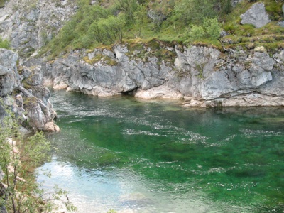 In der Nähe fließt - na, was denn? - kaltes Wasser, in dem sich manche auf Lauer legen, um die Lachse zu beobachten. Mir war es lieber, auf den Felsen zu steigen und die Rute zu schwingen. Pech gehabt - wenn der Köder auf der anderen Seite landet, muss man entweder eine halbe Stunde oder mehr um den Fluss watscheln, um darüber zu machen. Oder die Leine kappen!