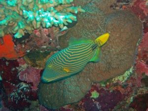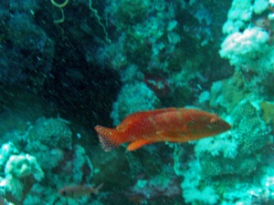 Wir bekamen häufig Besuch von Delfinen, meist von Spinnerdelfinen. Unter Wasser habe ich sie leider nicht sichten können. So etwas ist überhaupt recht selten. Als Schwimmer kann man sich Delfinen nähern, als Taucher eher nicht. So elegant finden die wohl die Geräusche nicht, die der Lungenautomat von sich gibt. Röchel! Natürlich durfte der Spitznasenbüschelbarsch nicht fehlen, der die schwarze Koralle bevölkerte.