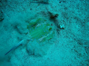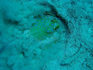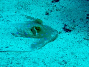 Mir haben es die kleinen Blaupunktrochen angetan, die anders als die große Verwandschaft sich vor einem häuslich niederlassen. Einmal kräftig schütteln, und nu guckt nur noch die Nase raus, die Augen natürlich auch. Wir sahen häufig Juwelenbarsche, die in wunderbaren prächtigen Farben durch die Gegend ziehen. Einen großen Zacki konnten wir leider nicht unseren Freund nennen.
