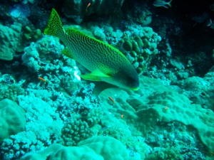 Aufregend war es den Büffelkopfpapageienfischen zu begegnen. Das sind Kaventsmänner von etwa einem Meter in der Länge und die Hälfte davon in der Höhe. Sie fressen Koralle wie Kekse und hinten kommt feinster Sand raus. Wie Herr Bundeskanzler Kohl so fein ausgedrückt hat, kommt es darauf an, was hinten raus kommt. Wenig romantisch, festzustellen, dass der schöne tropische Sand Schei… von Papageienfischen ist.